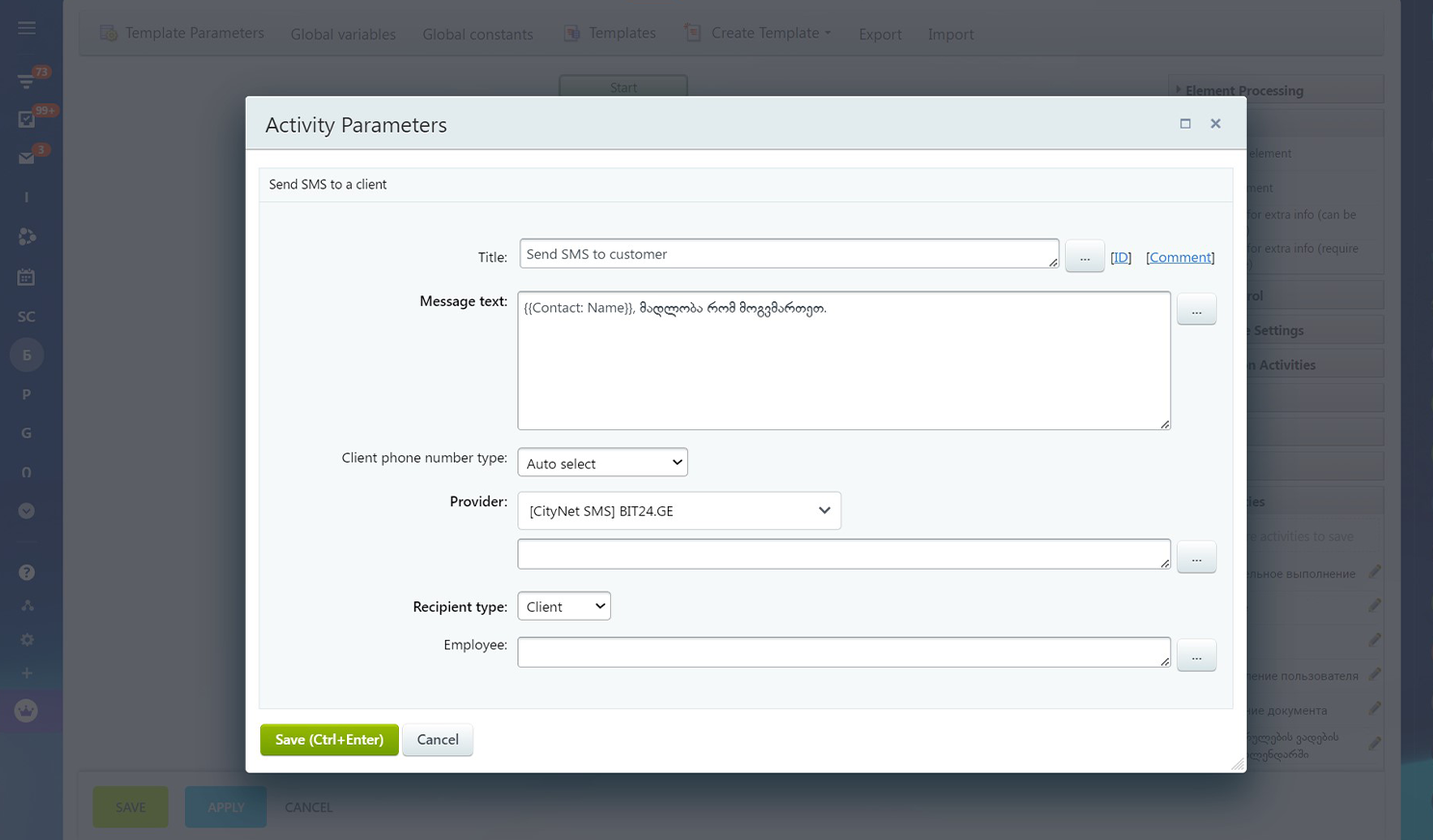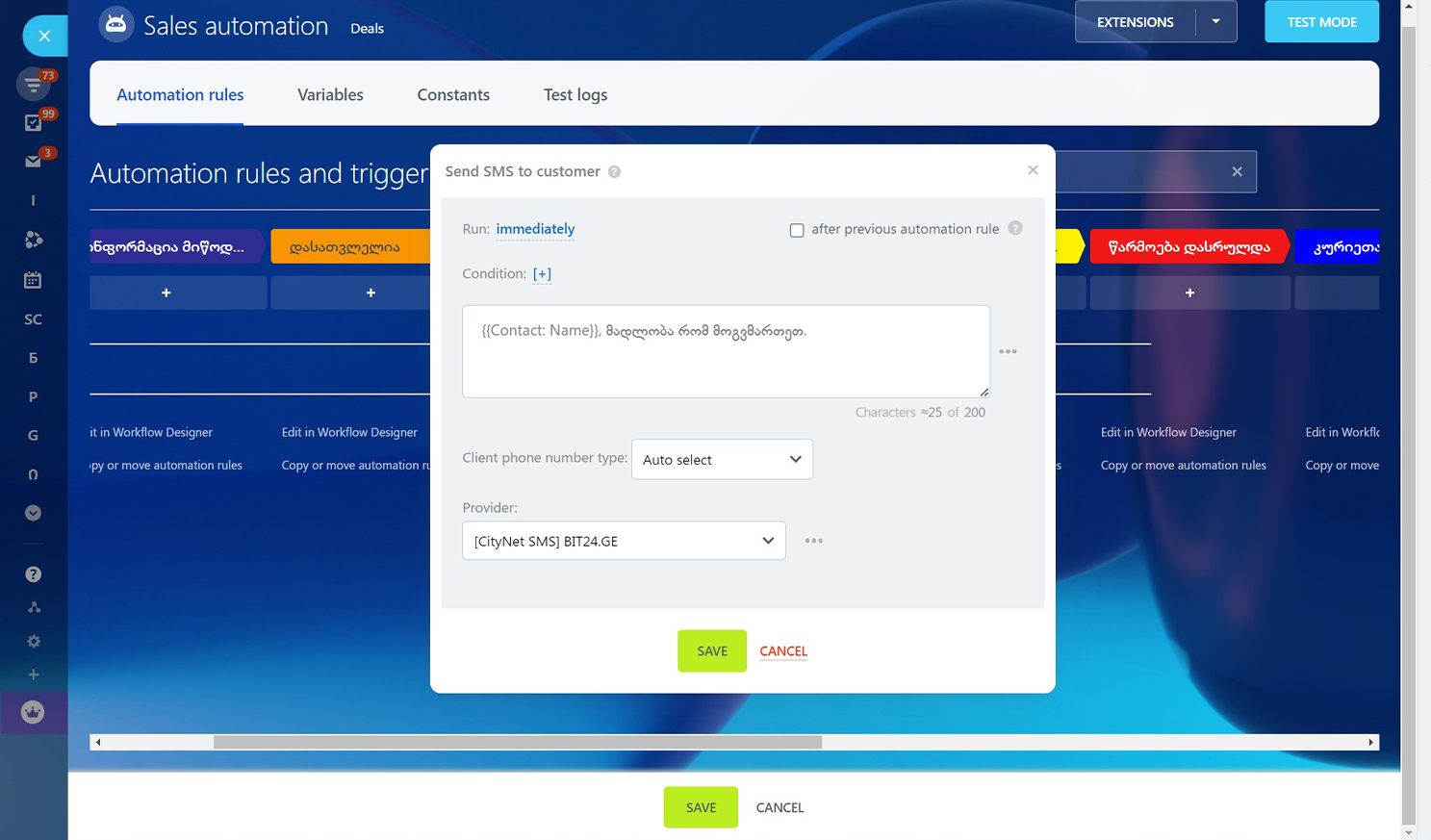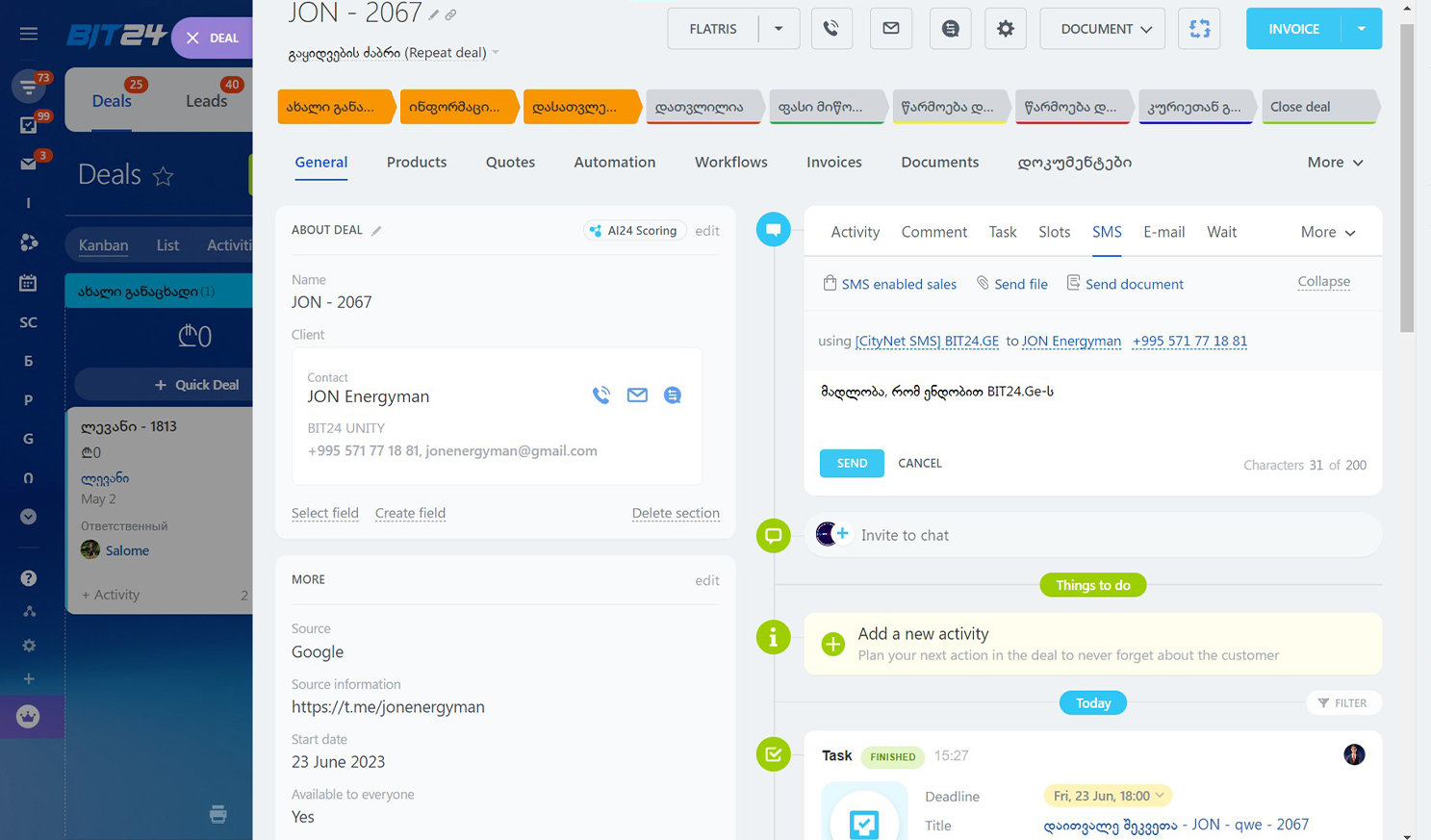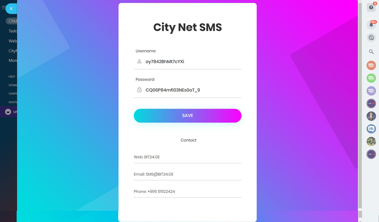 CityNet SMS - SMS mailing service in Georgia. CityNet SMS service allows you to send SMS manually or automatically, through: - Contact or company details - deals and leads details - Robots section - Business processes - CRM marketing for SMS mailings - Send documents via SMS