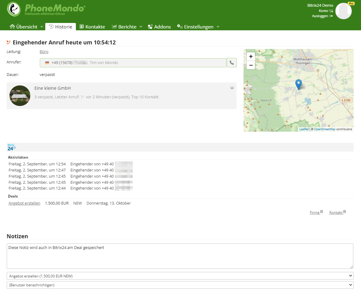 Notes, tasks, opportunities and other helpful data will make it more easy to make the call a successful call instead of just wasting time while searching for the data of the caller or letting the caller spell his name and address. All calls are tracked in the call history in the cloud and at the contacts in Bitrix24.