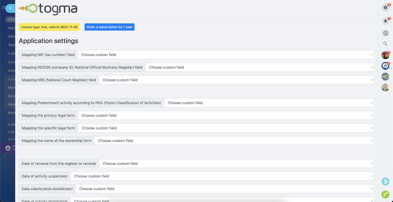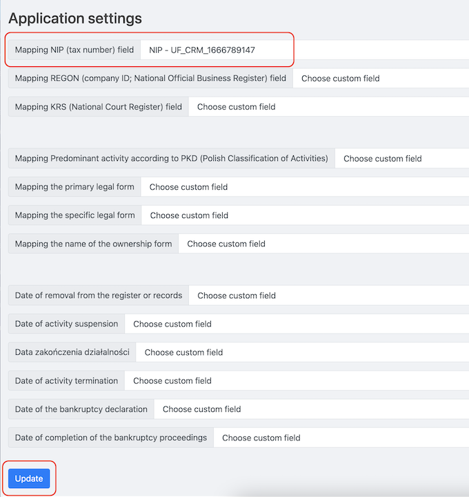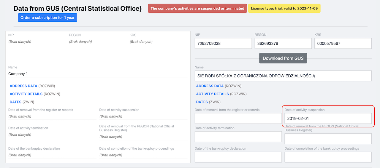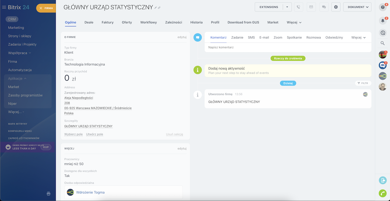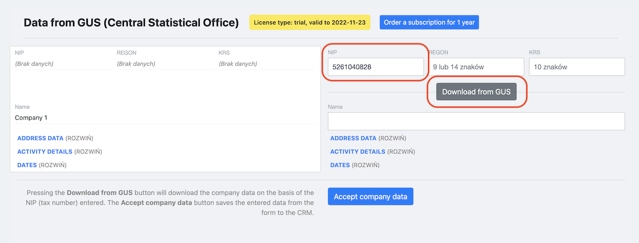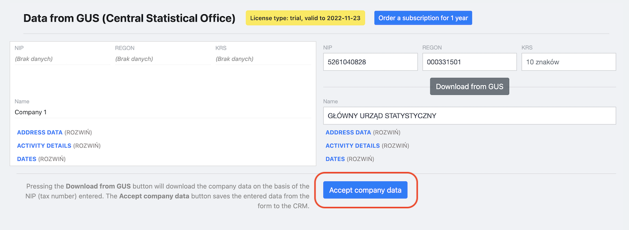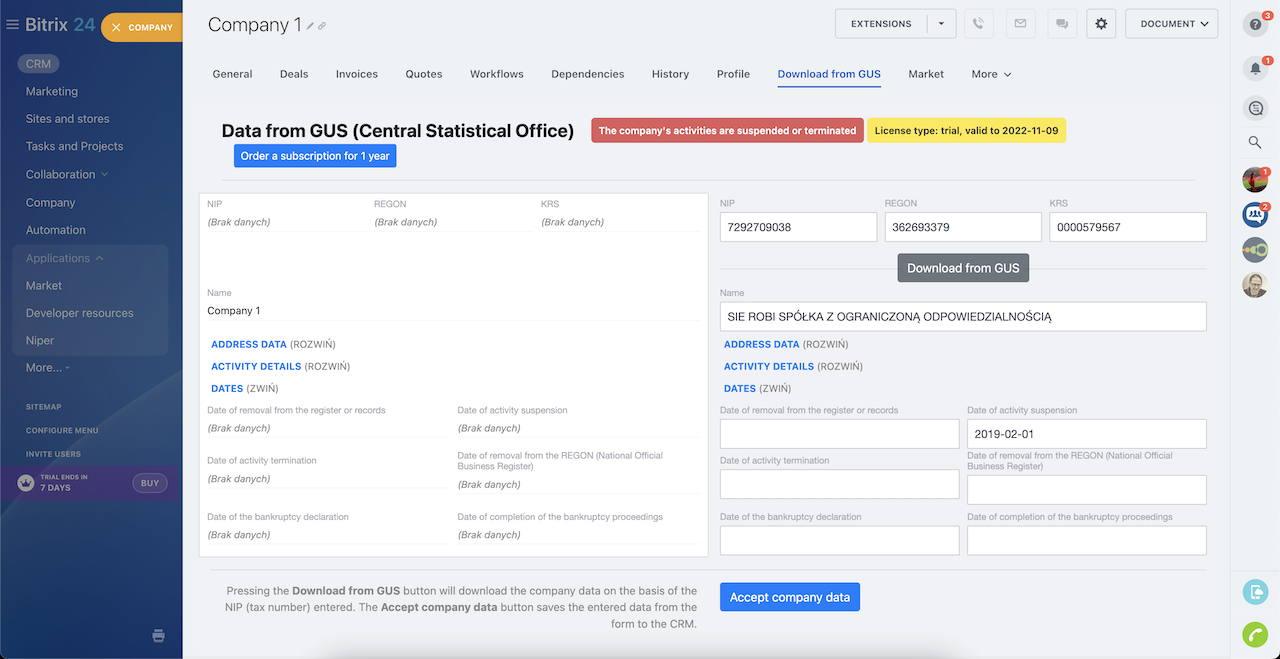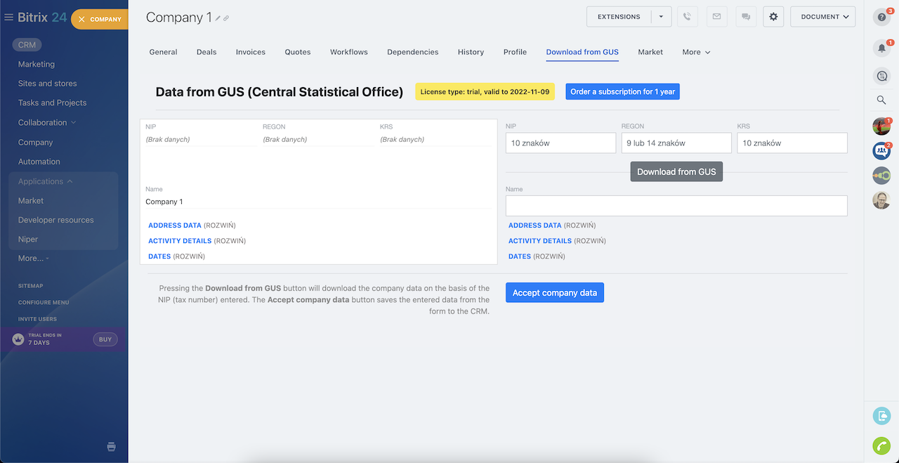 The application allows the integration of Bitrix24 with the Central Statistical Office of Poland (GUS) in order to download current company registration data.
