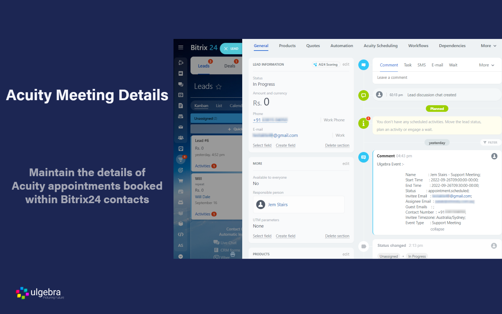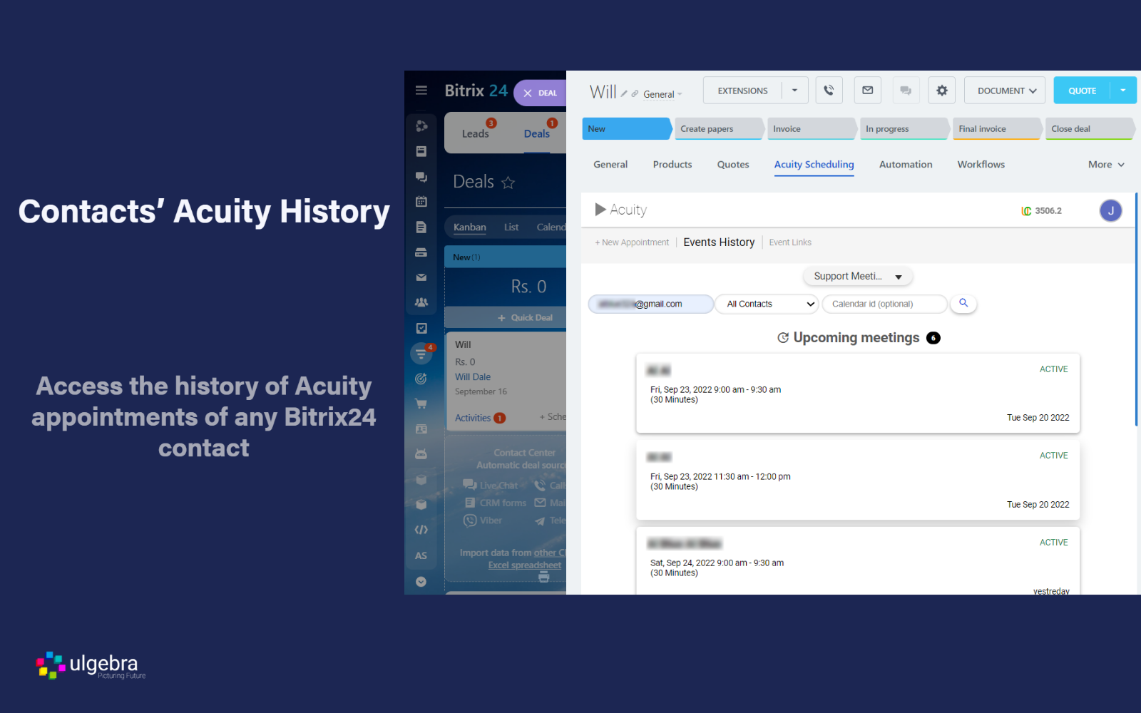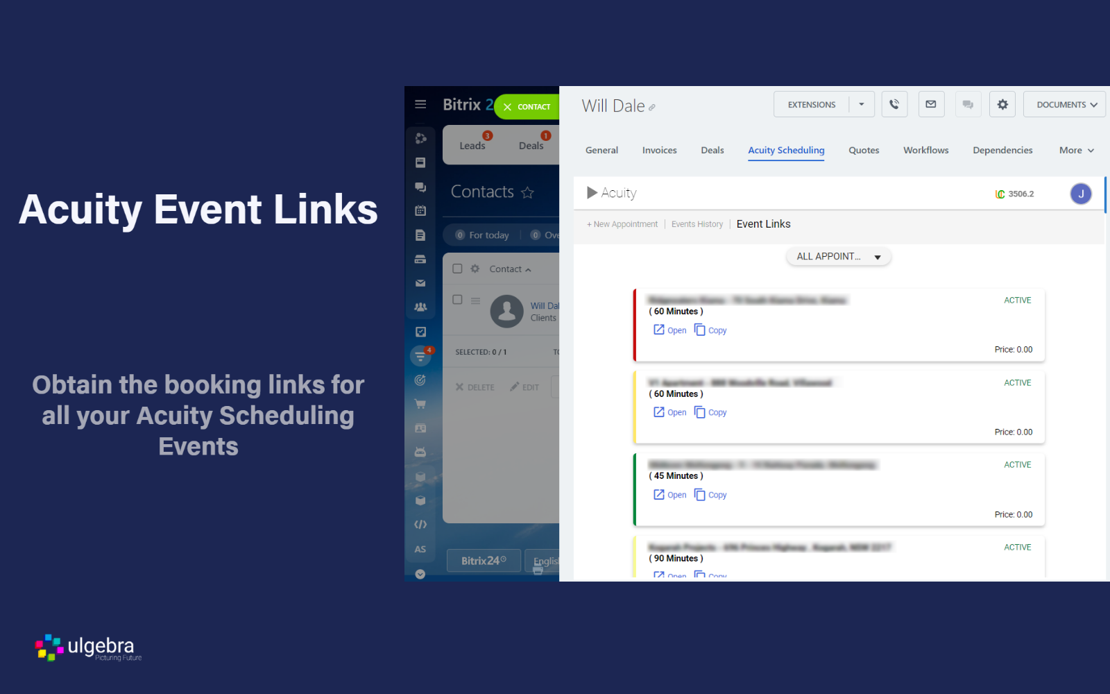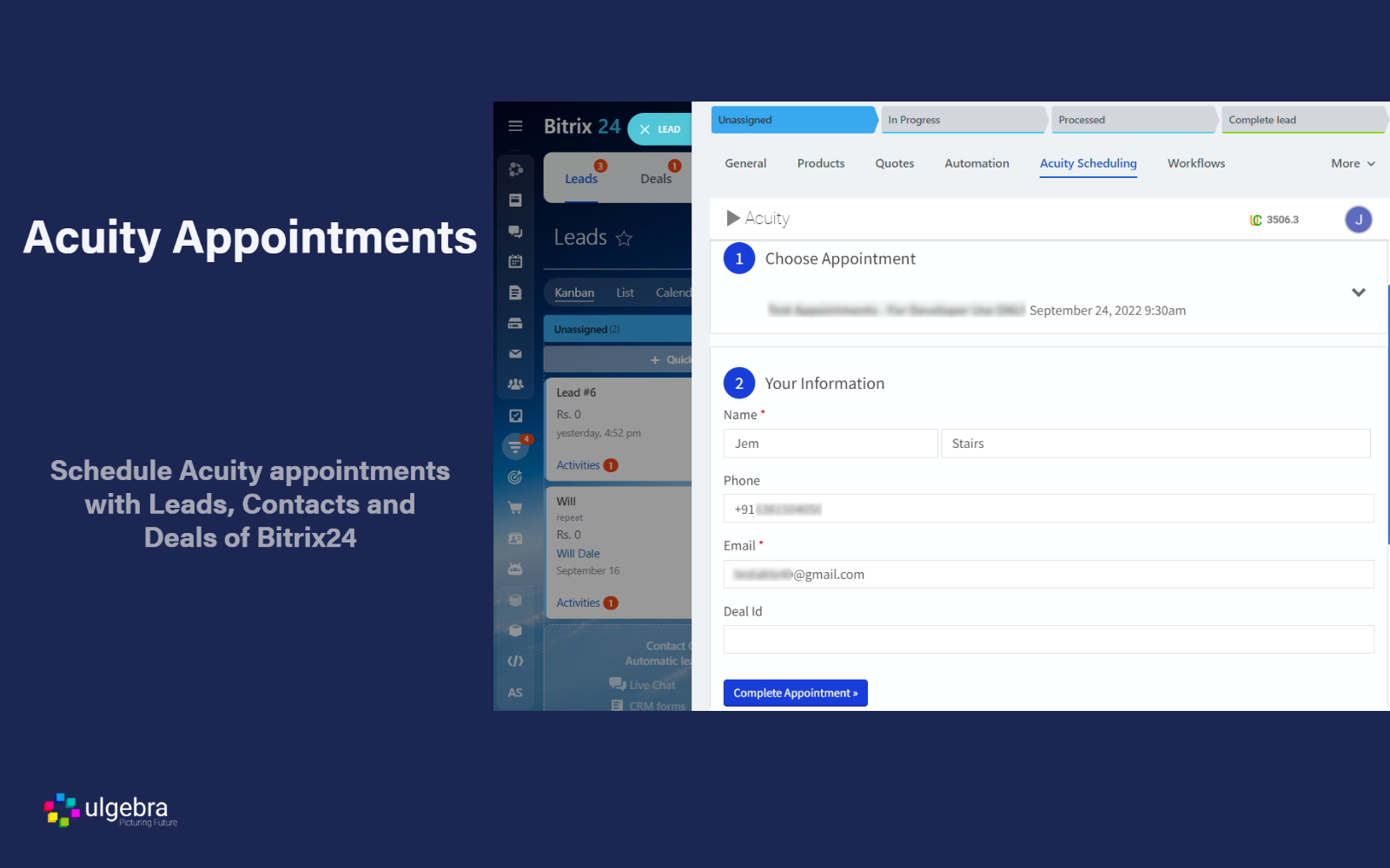 Schedule Acuity appointments with Leads, Contacts & Deals of Bitrix24 CRM using the Acuity Scheduling option from the panel on top. Sel ect the event for which the appointment is to be scheduled, and the preferred date and time. Enter the details required and schedule the appointment to receive the booking confirmation.