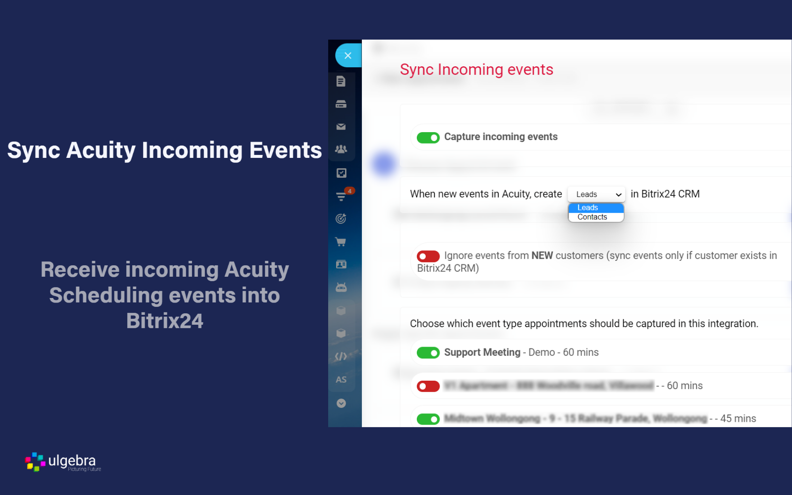 Sync the appointments scheduled using your Acuity booking links into Bitrix24 CRM. You can select the module into which new customers are to be created for meetings booked by non-existing customers and enable the events fr om which the incoming meeting events are to be synced.