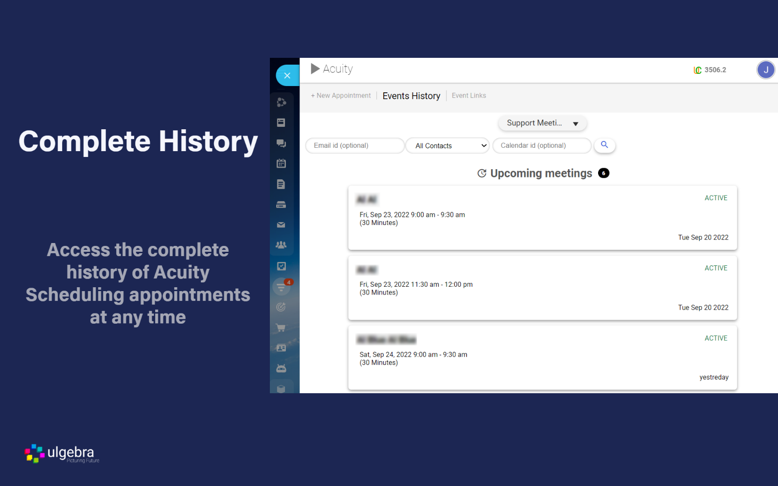 Within the Acuity Scheduling interface of any contact, sel ect 'Events History'. You can now view the history of the upcoming and past meetings along with the particular contact. Select any event to access the details of the event. You can also cancel or reschedule any upcoming event.