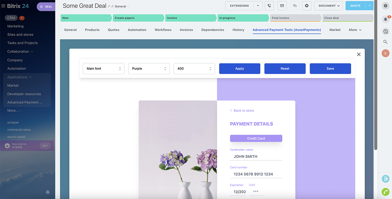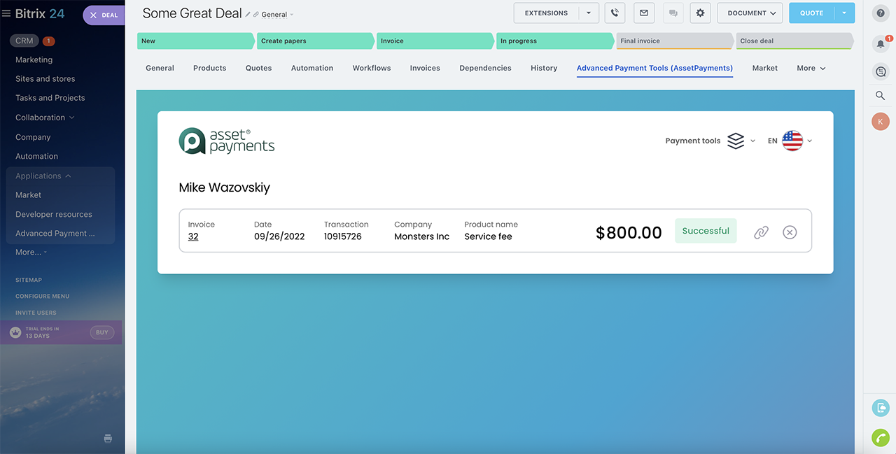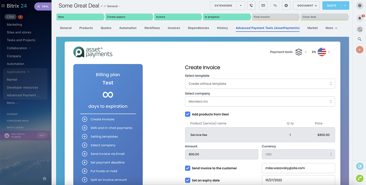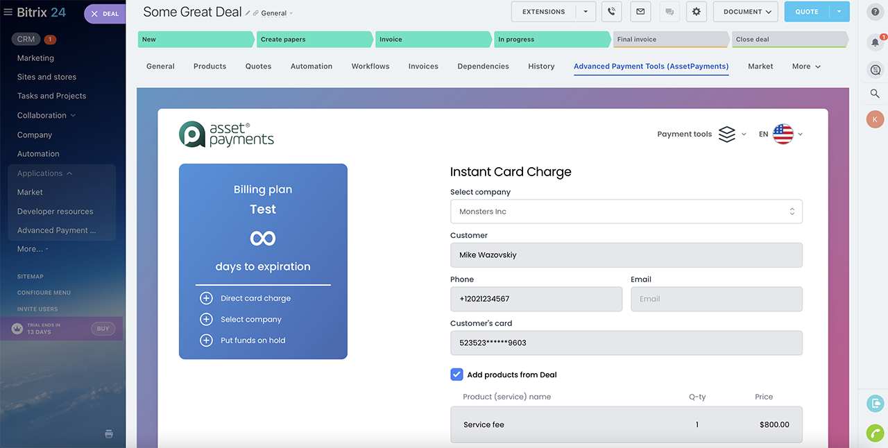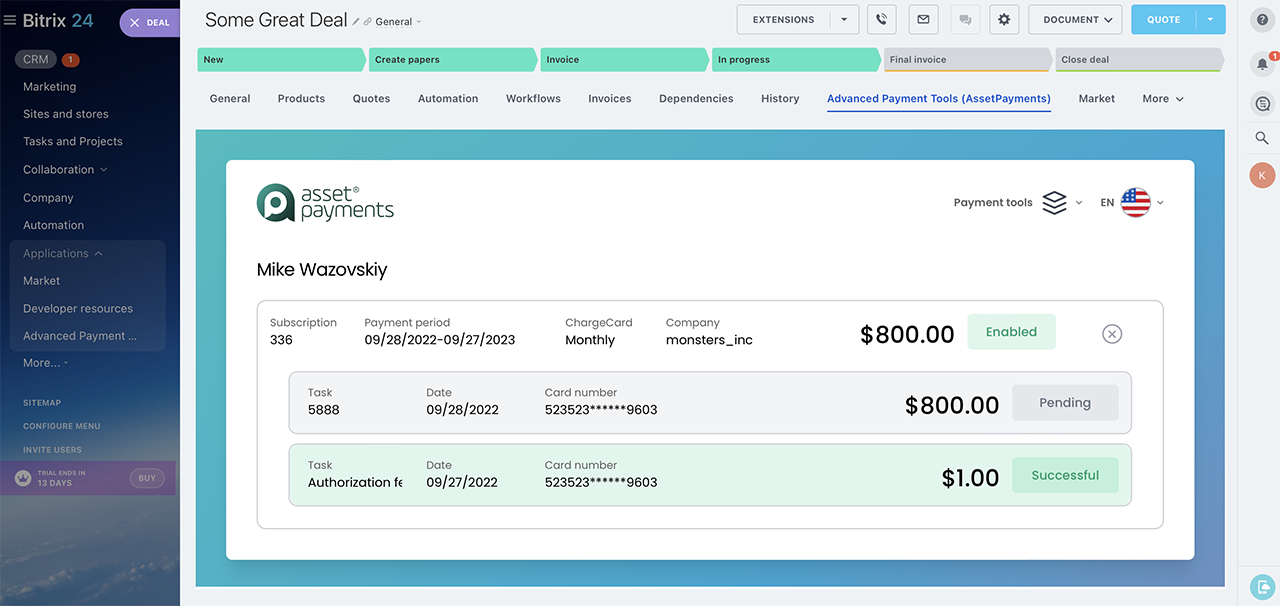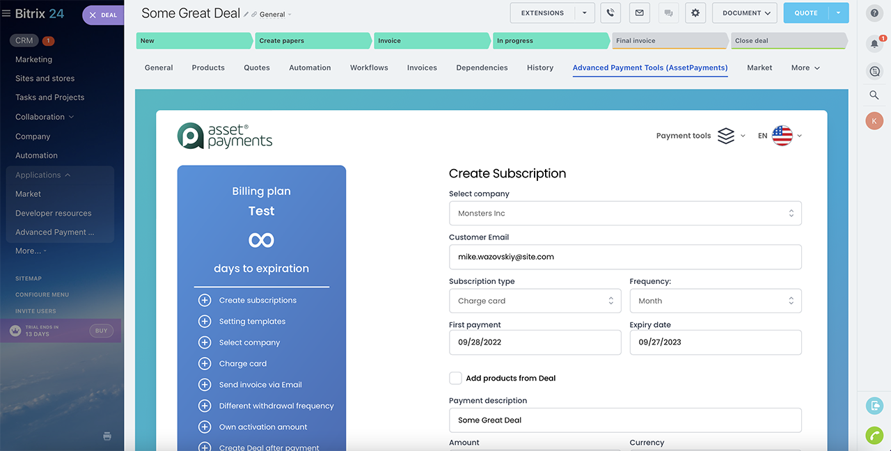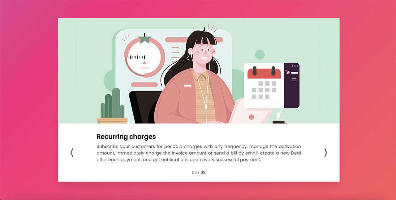 Subscribe your customers for periodic charges with any frequency, manage the activation amount, immediately charge the invoice amount or send a bill by email, create a new Deal after each payment, and get notifications upon every successful payment.