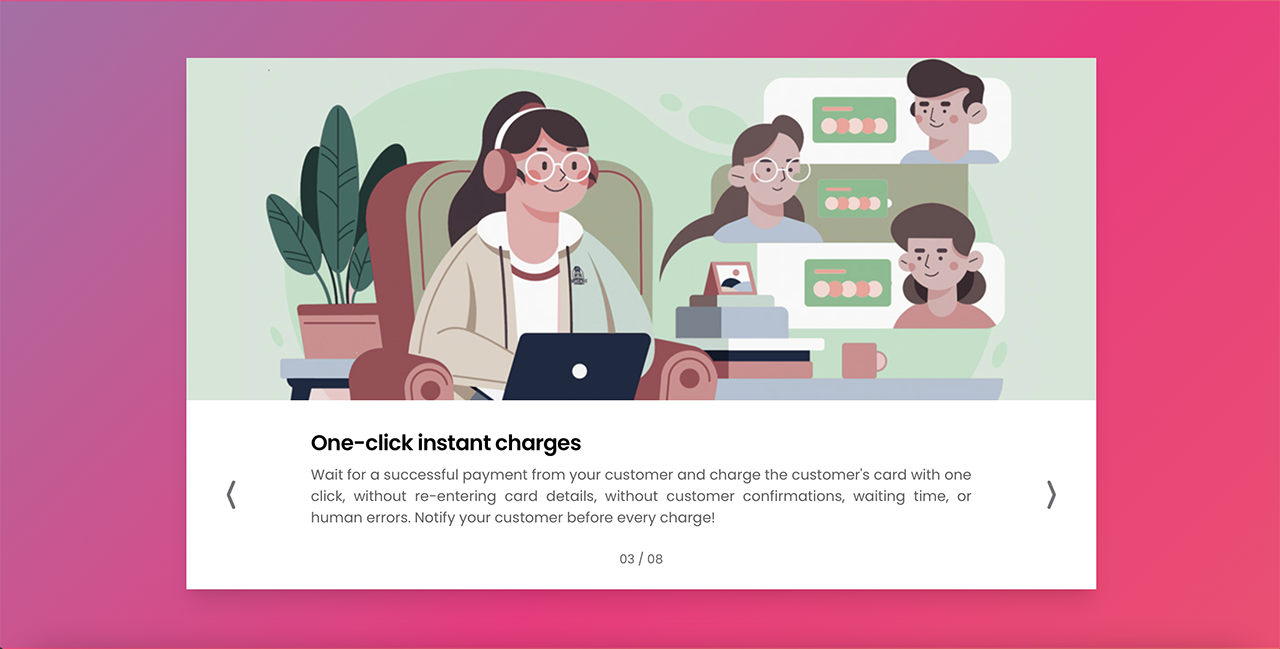 Wait for a successful payment from your customer and charge the customer's card with one click, without re-entering card details, without customer confirmations, waiting time, or human errors. Notify your customer before every charge!