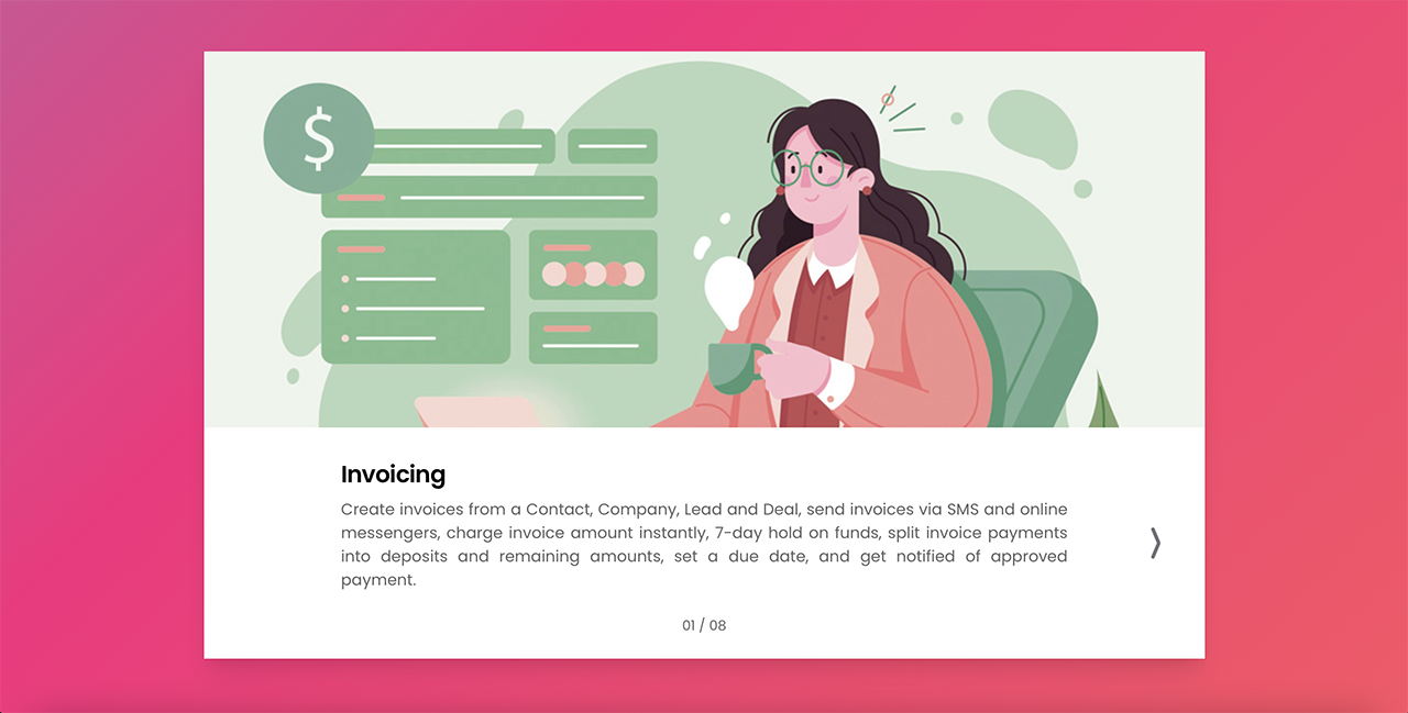 Create invoices from a Contact, Company, Lead and Deal, send invoices via SMS and online messengers, charge invoice amount instantly, 7-day hold on funds, split invoice payments into deposits and remaining amounts, set a due date, and get notified of approved payment.