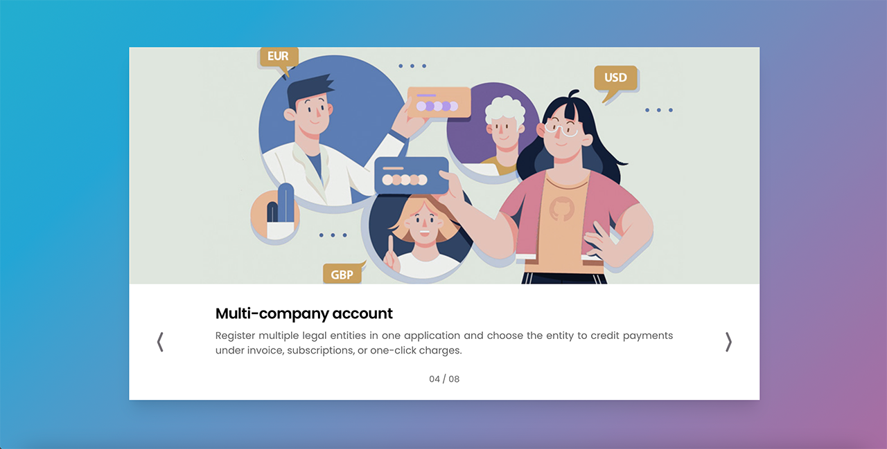 Register multiple legal entities in one application and choose the entity to credit payments under invoice, subscriptions, or one-click charges.