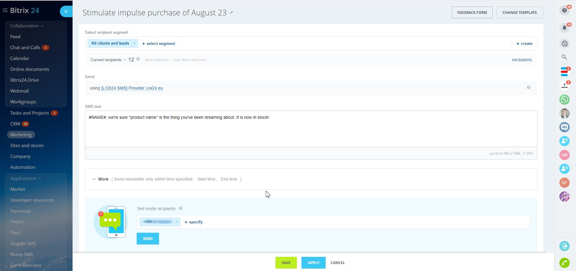 Send SMS from Bitrix24 via CRM automation rules for all leads or deals.