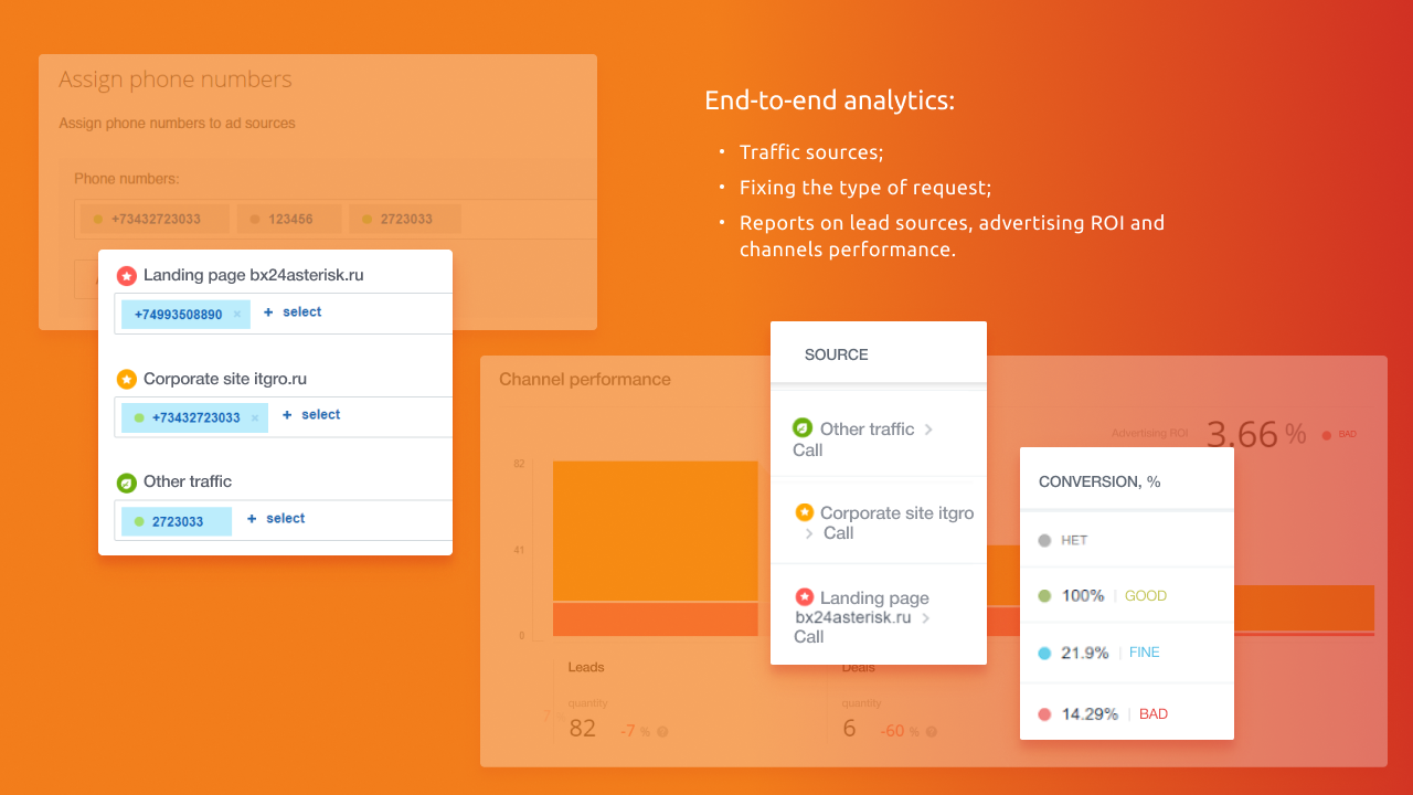 ✓ End-to-end analyticsFixing traffic sources and the type of request (call, email, chat) in the lead card.