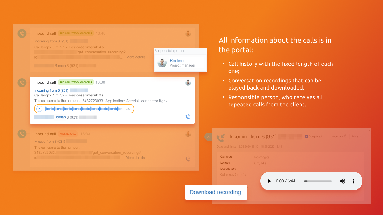 ✓ Automatic call generation in the Bitrix24Call history with each call's fixed length and conversation recordings that can be reproduced and downloaded.