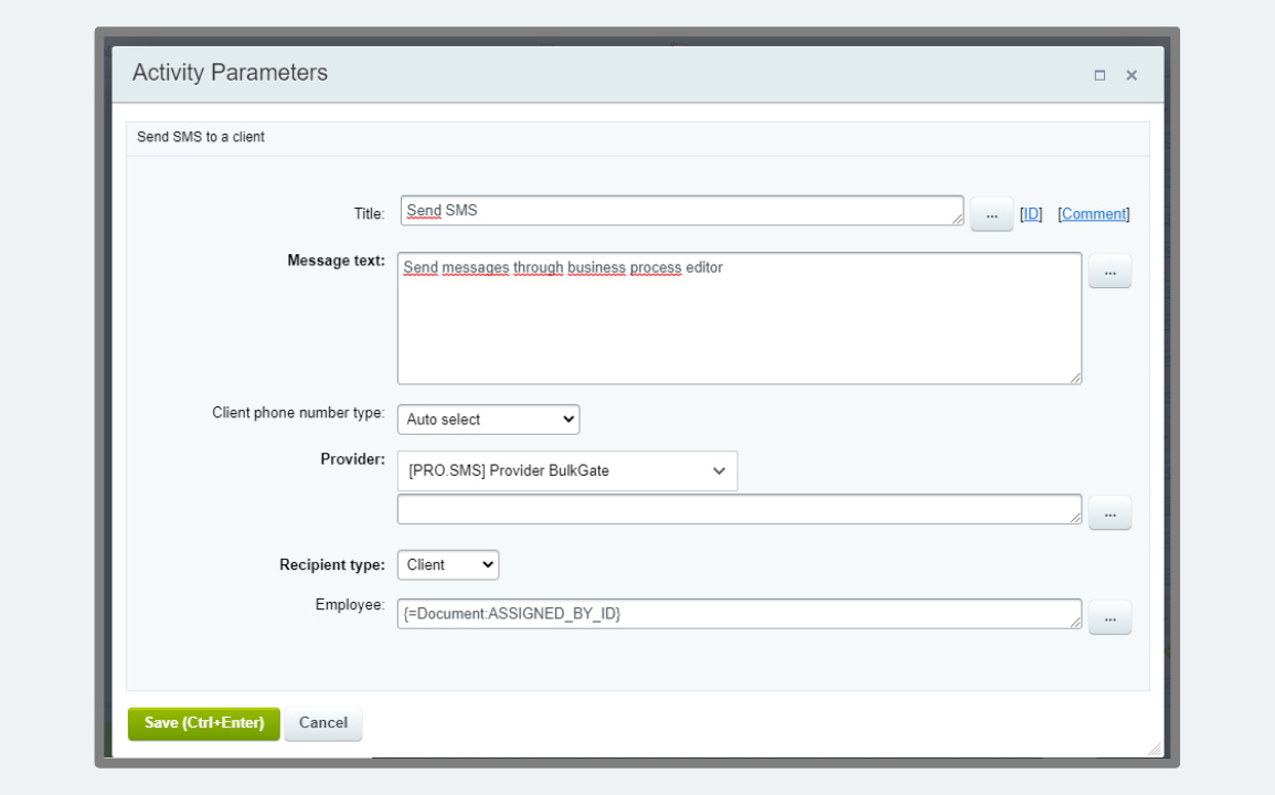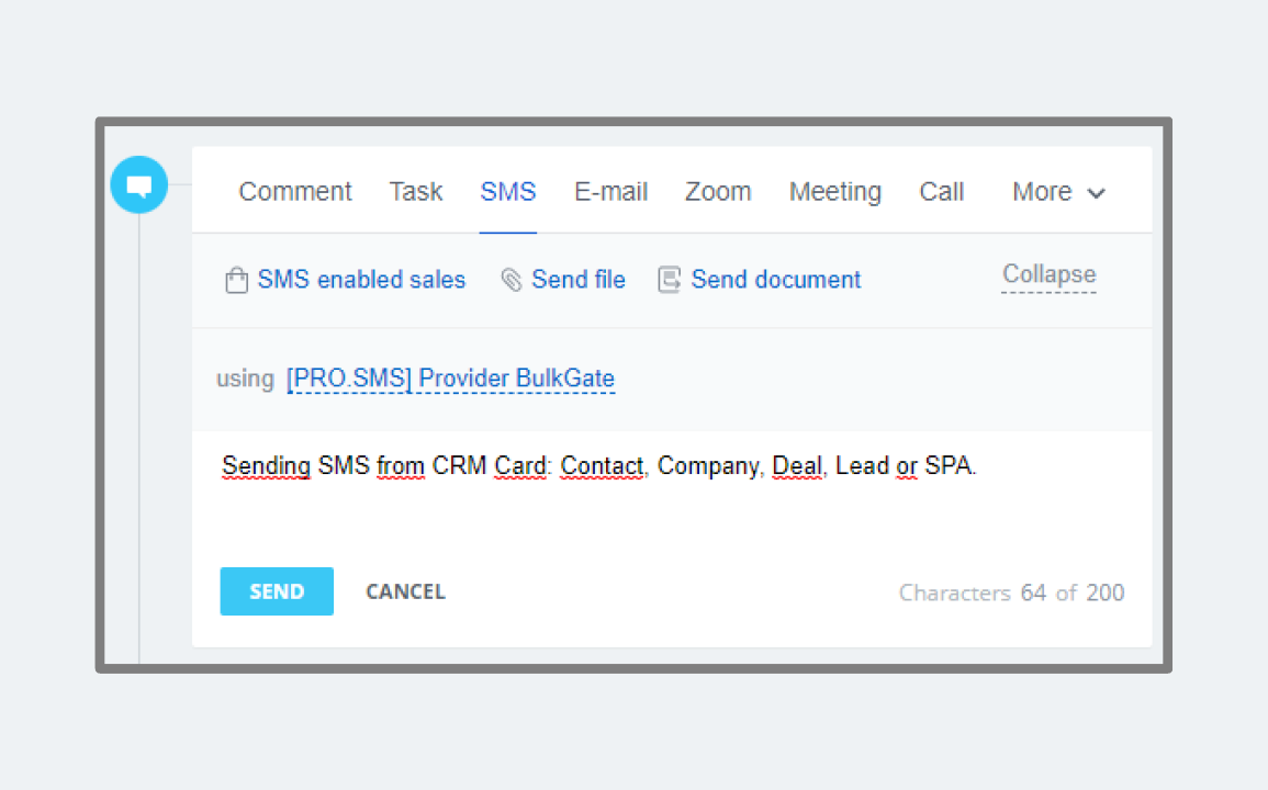 PRO.SMS allows you to send SMS from Bitrix24 through Bulkgate, one of the SMS providers with one of the most competitive rates on the market.