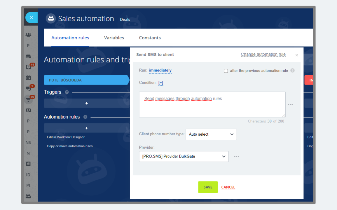 Send SMS automatically by using triggers, CRM automation rules and workflows.
