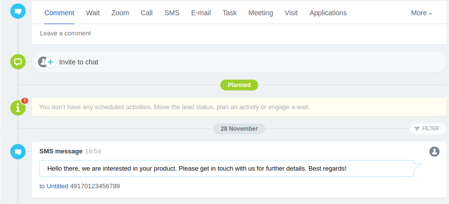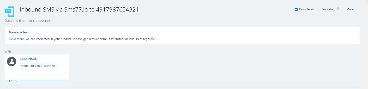 Possibility to append inbound SMS to leads and contacts. Very useful for having all communication inside Bitrix24.
