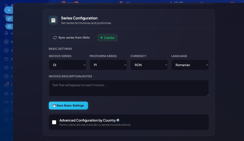 ✓ Oblio.eu — Full integration (invoices, proformas, multi-currency, VAT)