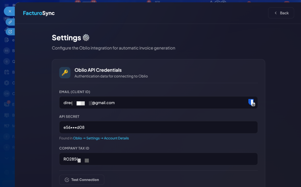 2. Enter your Oblio.eu API credentials in Settings