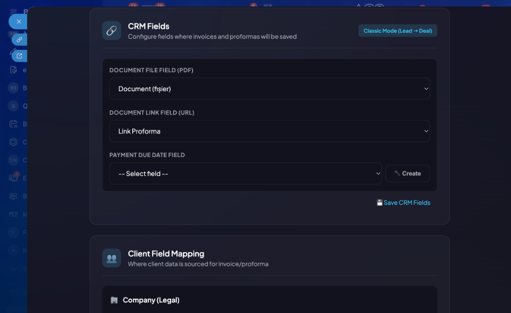 • Client data (company, tax ID, address) mapped directly from CRM contacts/companies